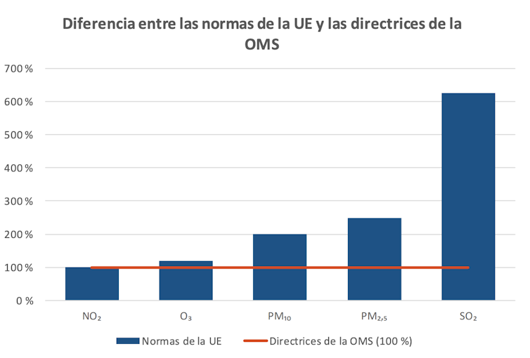 Estos valores son mucho menos estrictos en comparación con las directrices de la OMS en el caso de las PM₂,₅ y el SO₂ y menos estrictos en el caso de las PM₁₀ (media anual) y el ozono. Con respecto a las PM₁₀ (valor diario) y el NO₂, las normas de la UE están armonizadas con las directrices de la OMS y permiten el exceso esporádico de los límites.